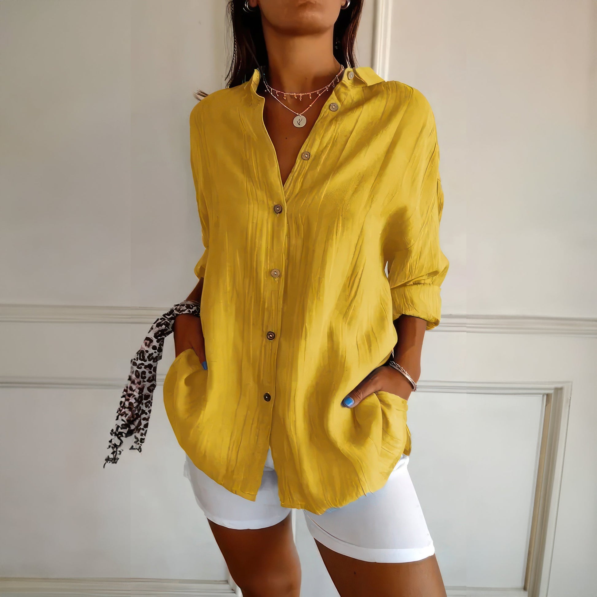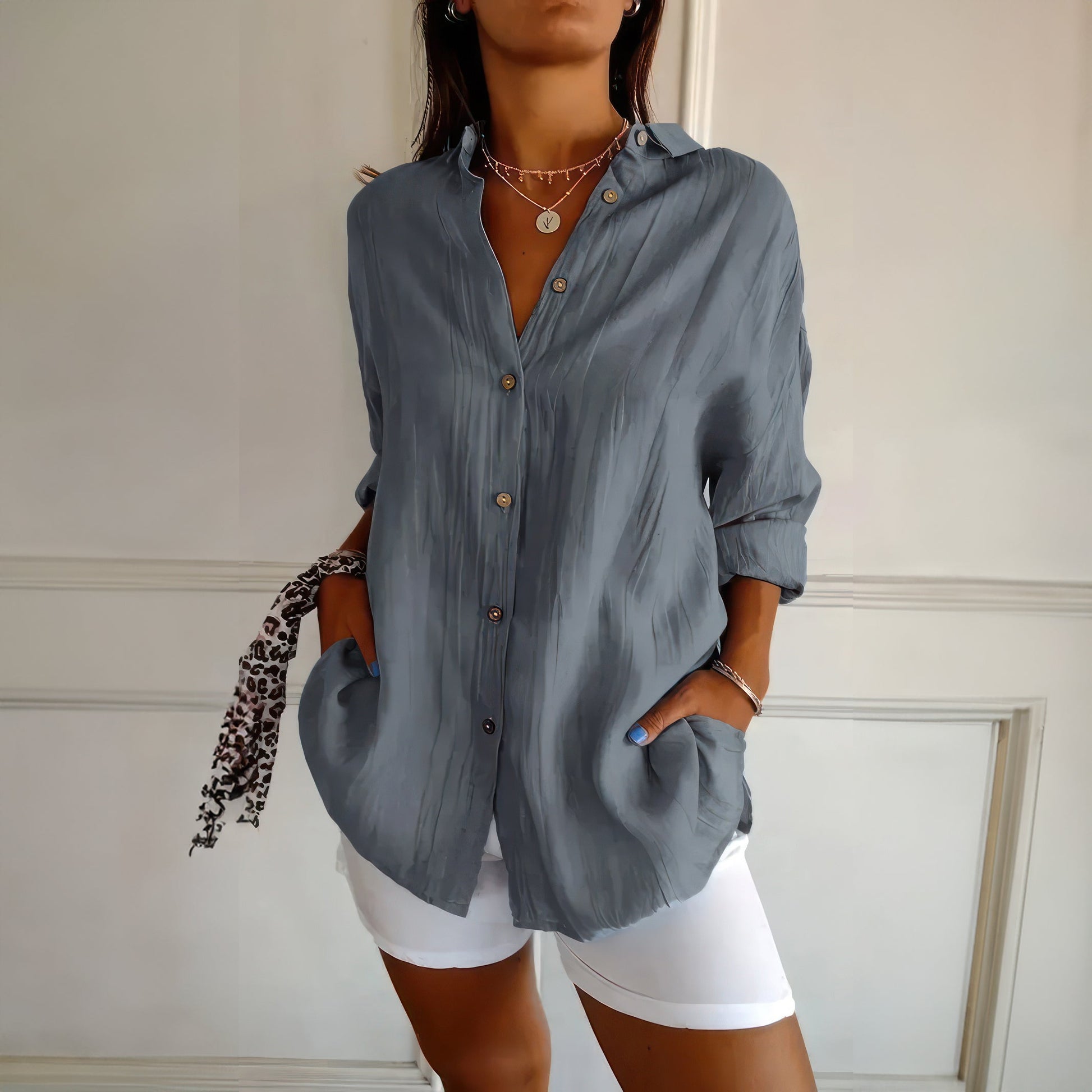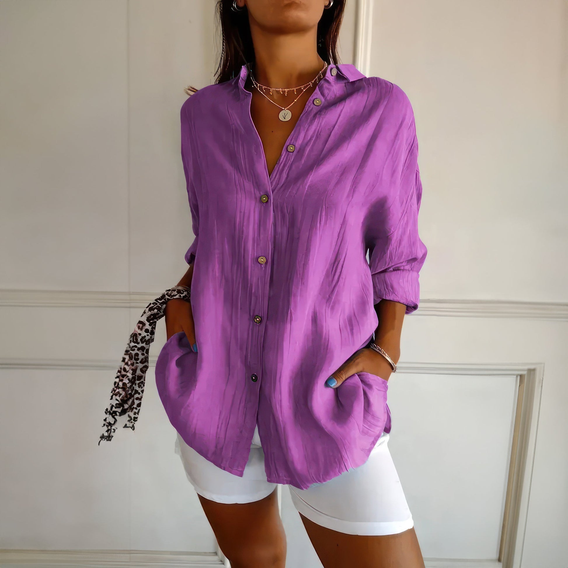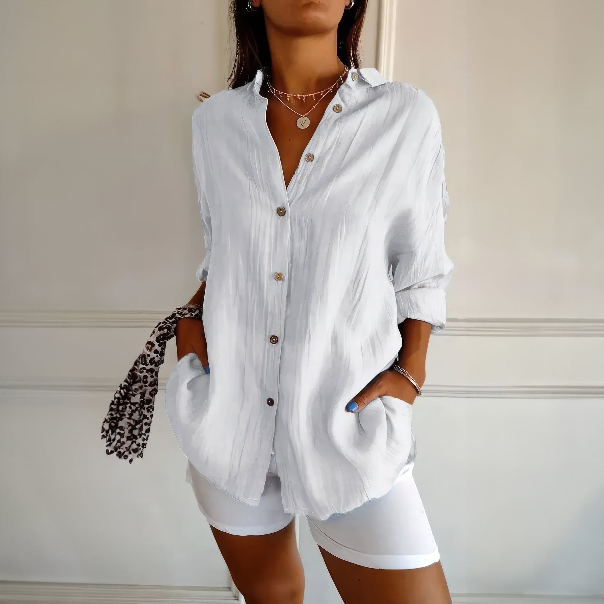 Klassisk damskjorta med texturerat plisserat enkelknäppt slag