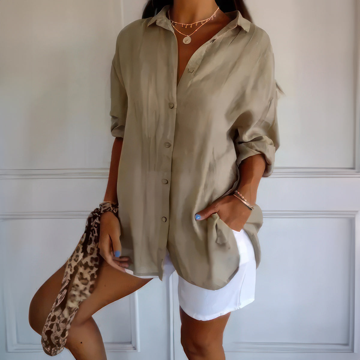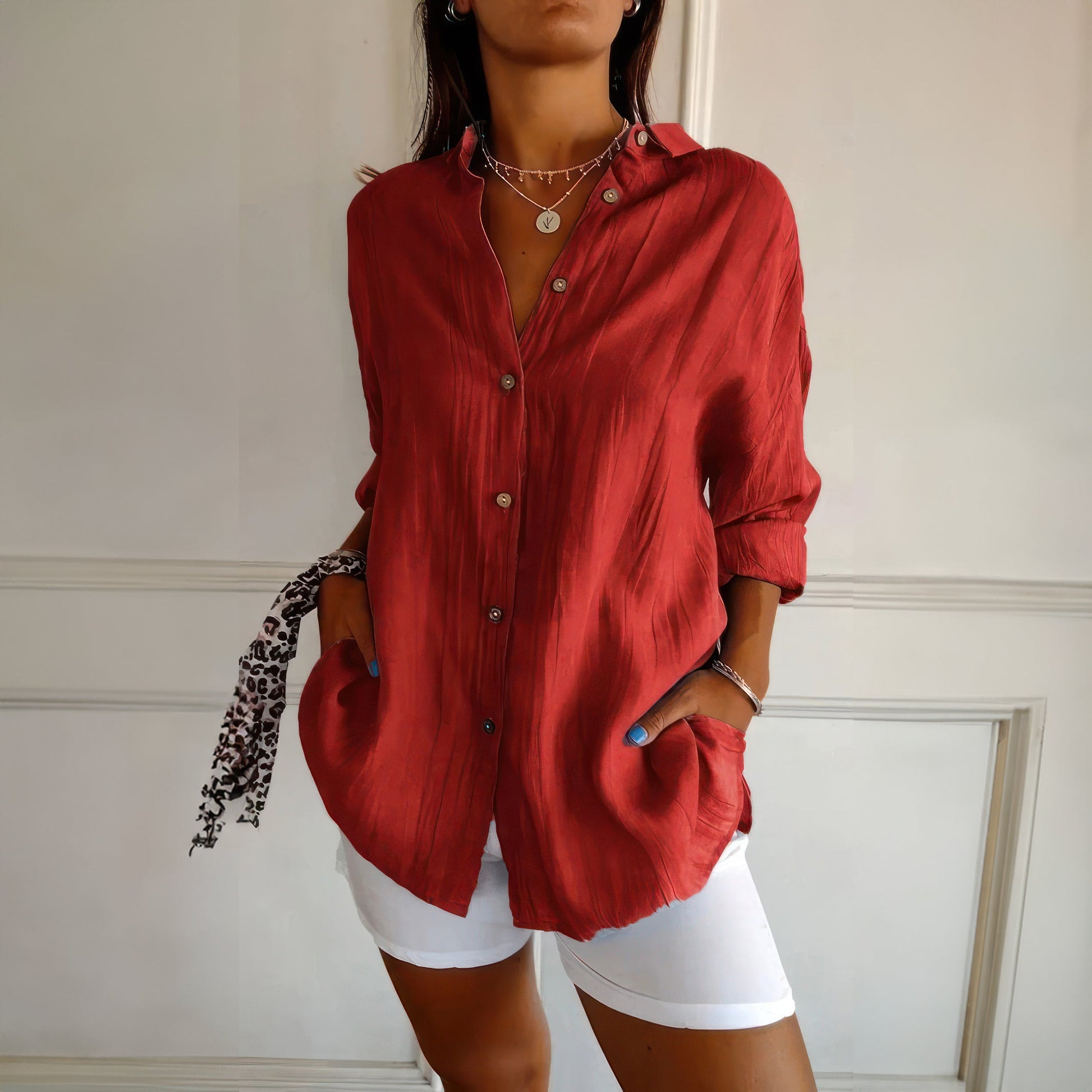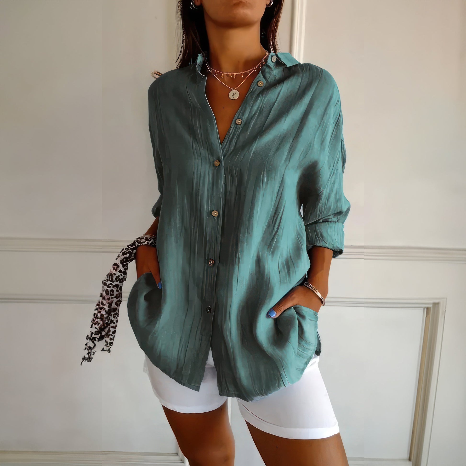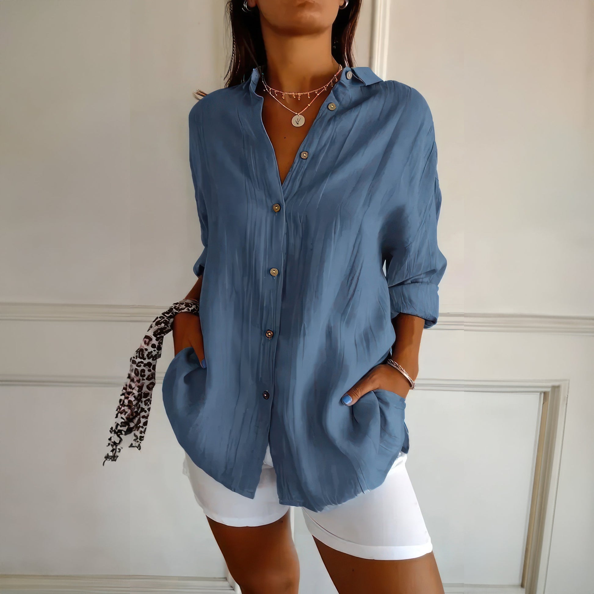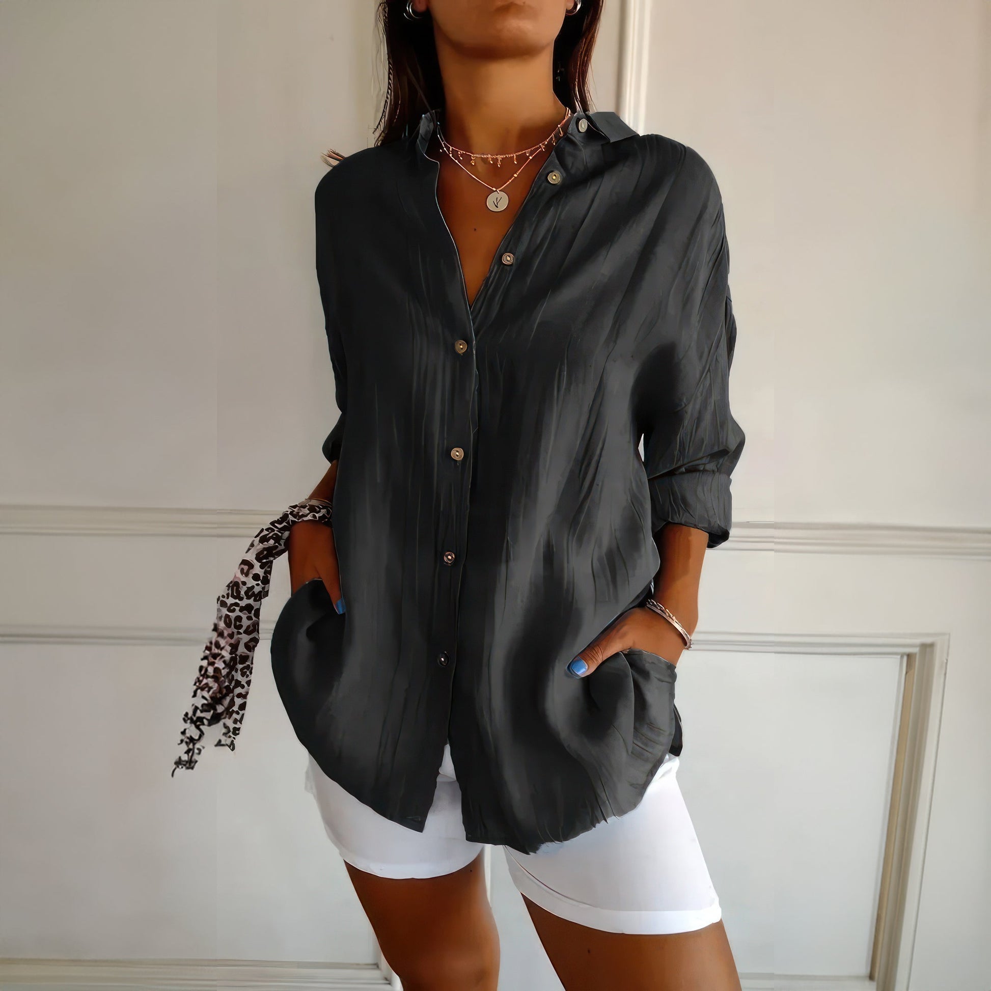 Klassisk damskjorta med texturerat plisserat enkelknäppt slag